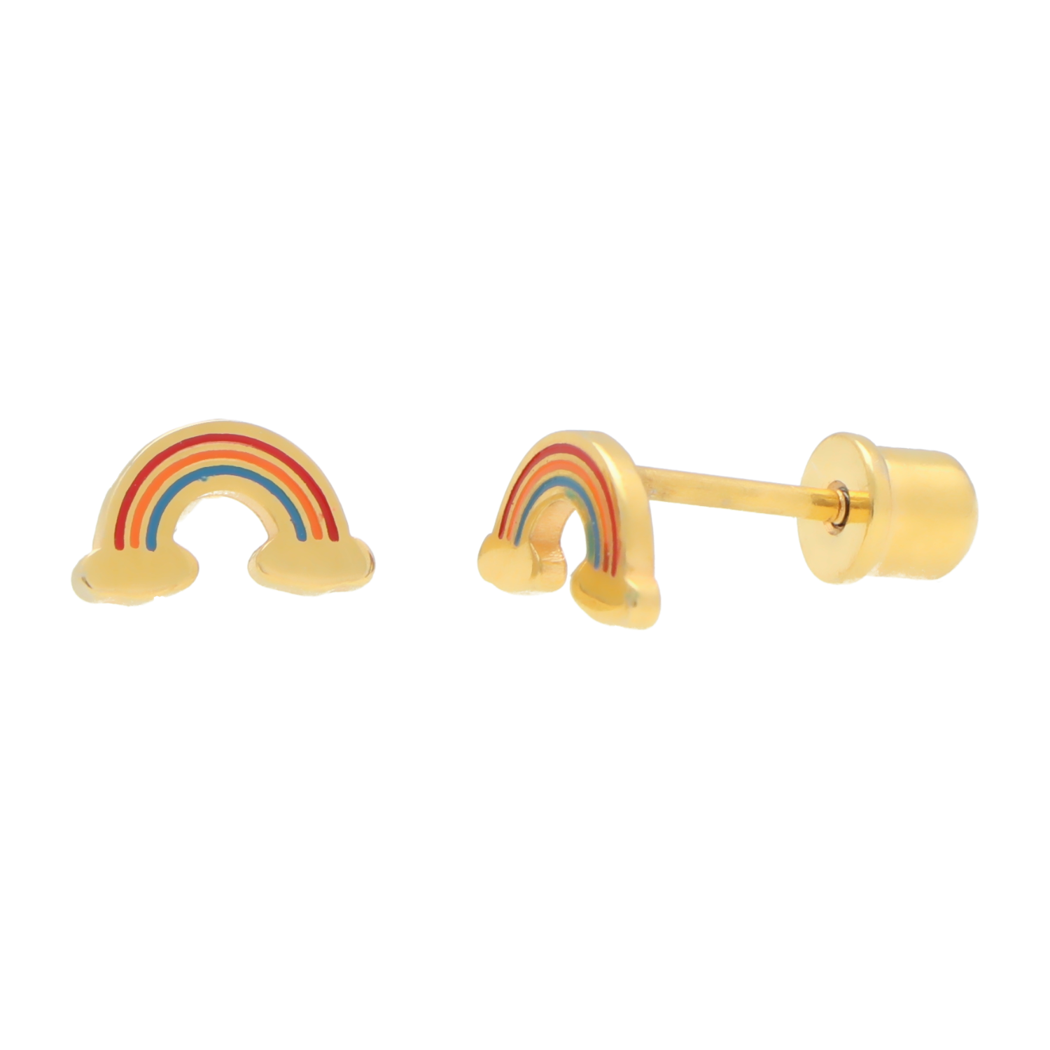 Vrolijke goudkleurige regenboog oorbellen voor meisjes, gemaakt van 316L chirurgisch staal met kleurrijke emaille. Hypoallergeen, sterk en veilig dankzij de schroefsluiting – ideaal voor dagelijks gebruik of als cadeautje!