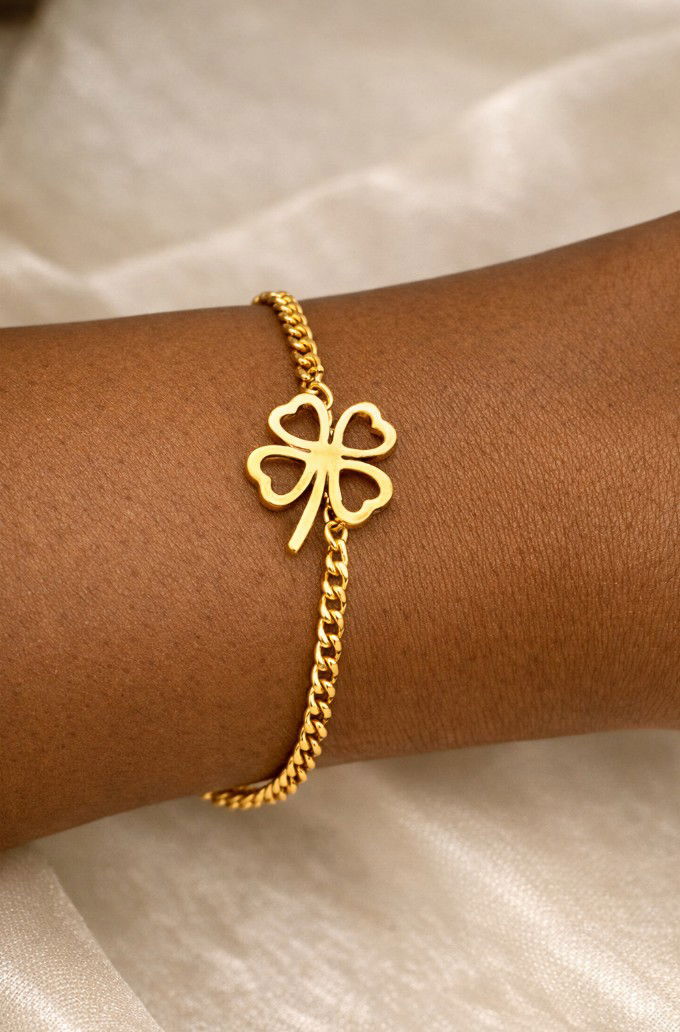 Draag geluk om je pols met deze elegante klavertje vier armband van 316L premium roestvrij staal met gold plated afwerking.