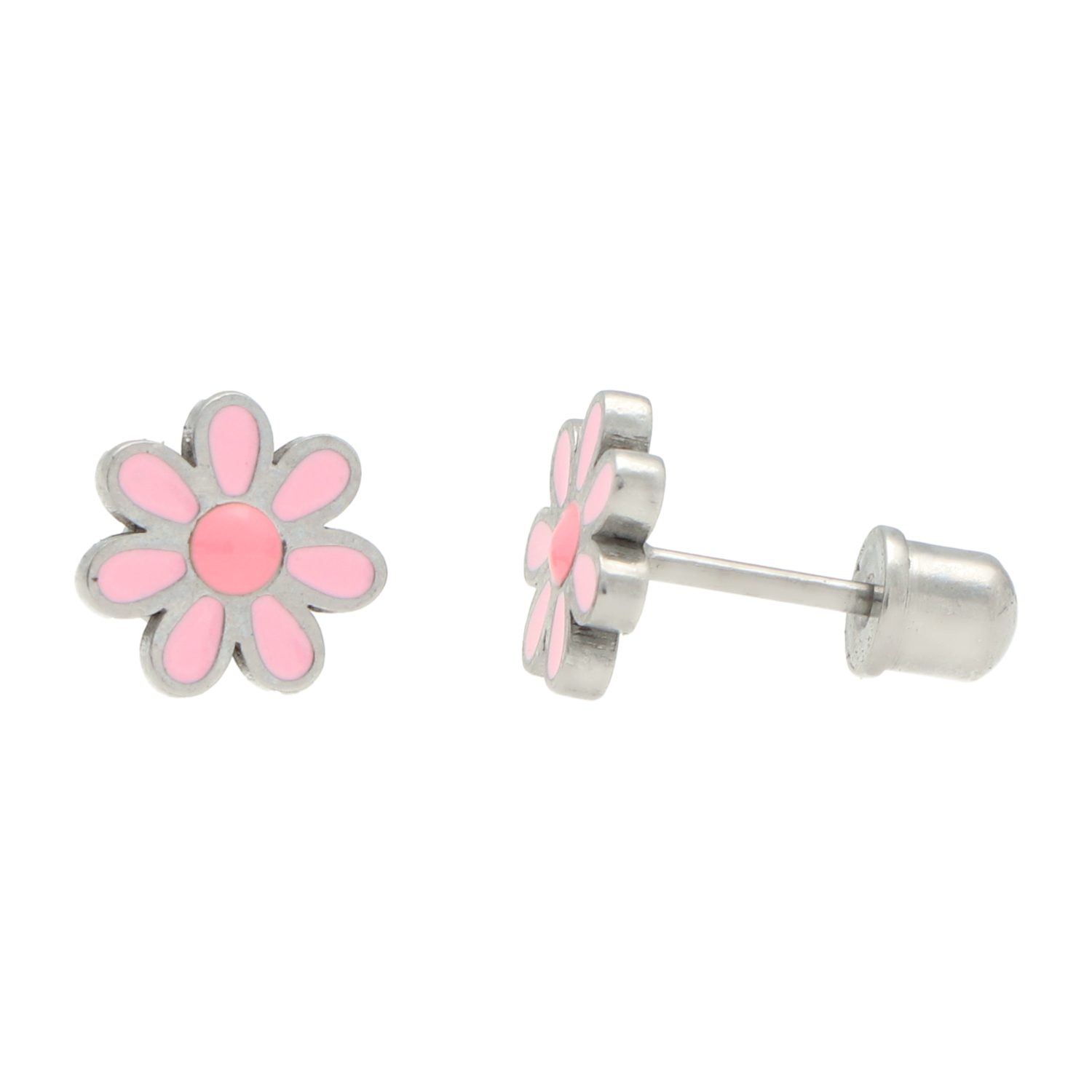 Lieve Zilverkleurige madelief oorbellen voor meisjes, gemaakt van 316L chirurgisch staal met roze middensteentje. Hypoallergeen, duurzaam en comfortabel – perfect voor dagelijks gebruik of als cadeautje!